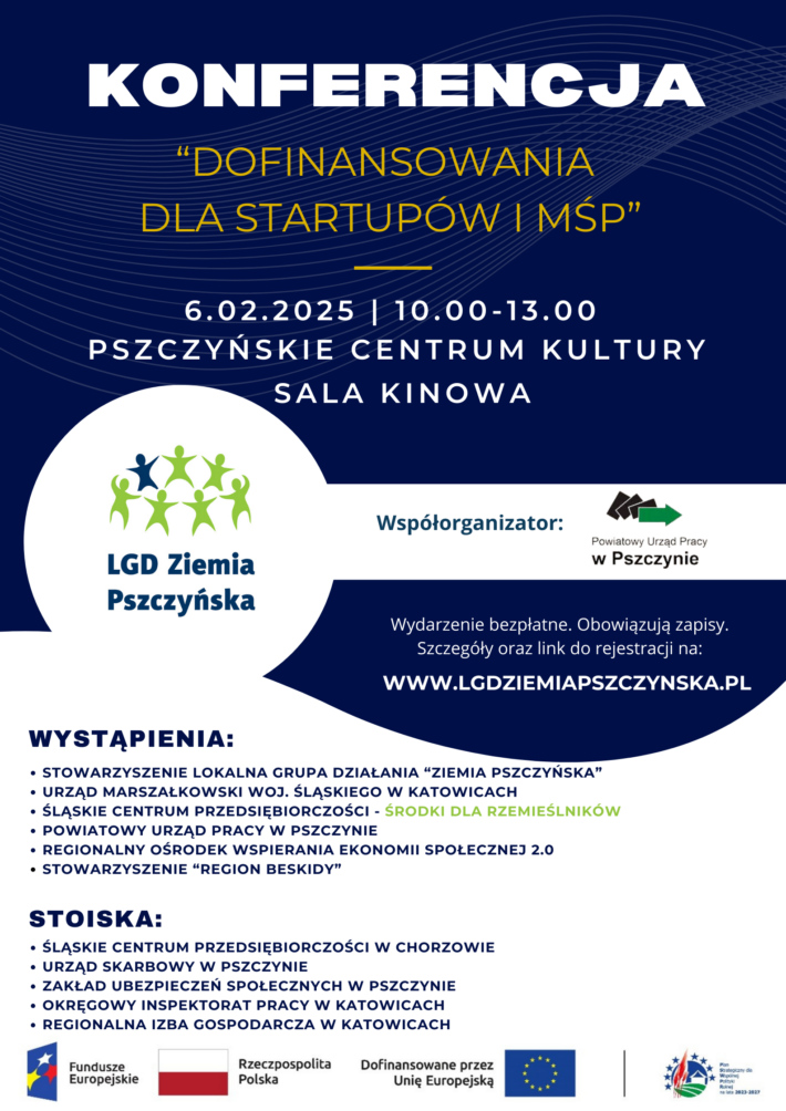 Stowarzyszenie Lokalna Grupa Działania „Ziemia Pszczyńska” informuje o Konferencji dot. dofinansowania dla STARTupów i MŚP organizowaną we współpracy z Powiatowym Urzędem Pracy w Pszczynie w dniu 6 lutego w godzinach od 10:00 do 13.00 w Pszczyńskim Centrum Kultury.