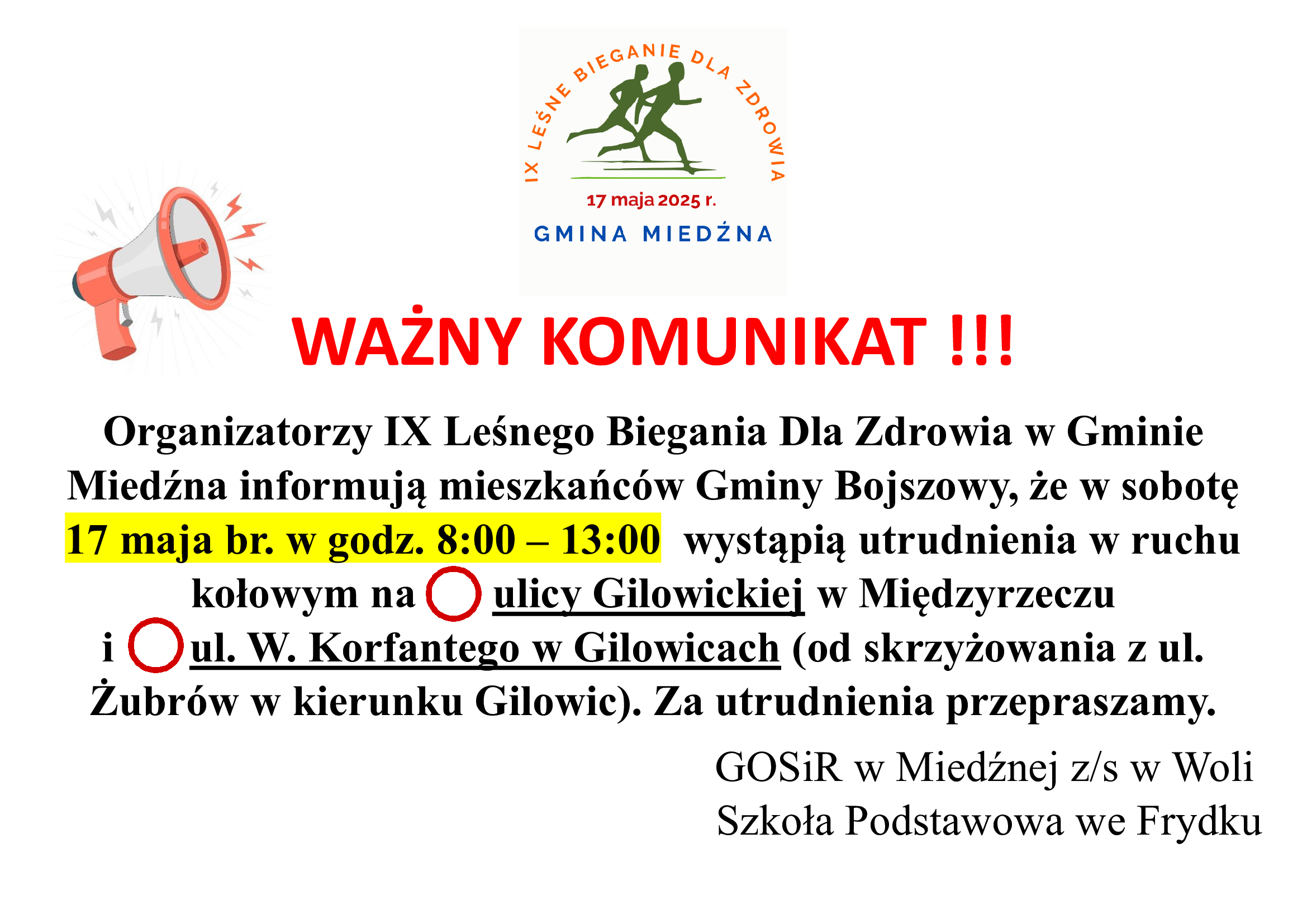 Na prośbę Gminnego Ośrodka Sportu i Rekreacji w Miedźnej z/s w Woli przekazujemy komunikat o utrudnieniach w ruchu kołowym w dniu 17 maja br. w godz. 8:00 – 13:00 na [ … ]