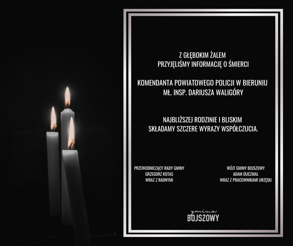 Z głębokim żalem przyjęliśmy informację o nagłej śmierci Komendanta Powiatowego Policji w Bieruniu mł. insp. Dariusza Waligóry. Najbliższej rodzinie i bliskim składamy najszczersze wyrazy współczucia.