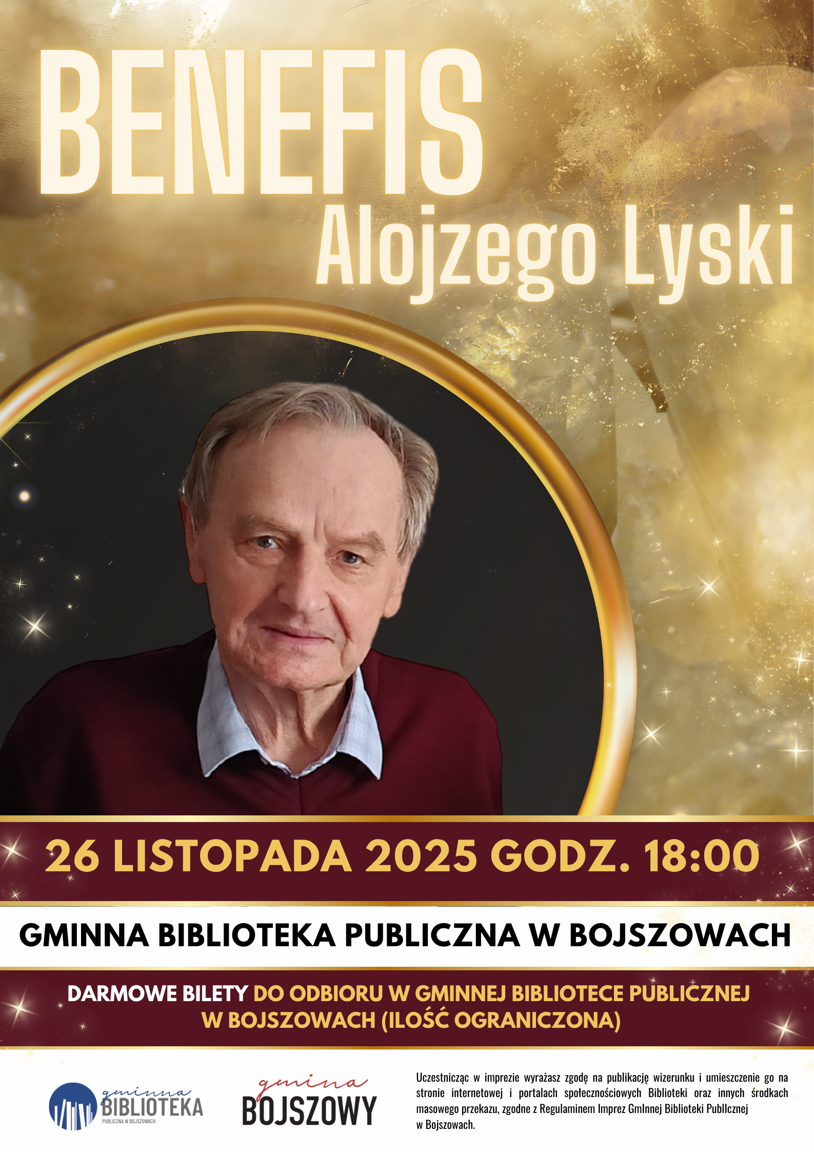 | 26 listopada 2025 r. 18:00 | Benefis Alojzego Lyski | Gminna Biblioteka Publiczna w Bojszowach | Plakat |